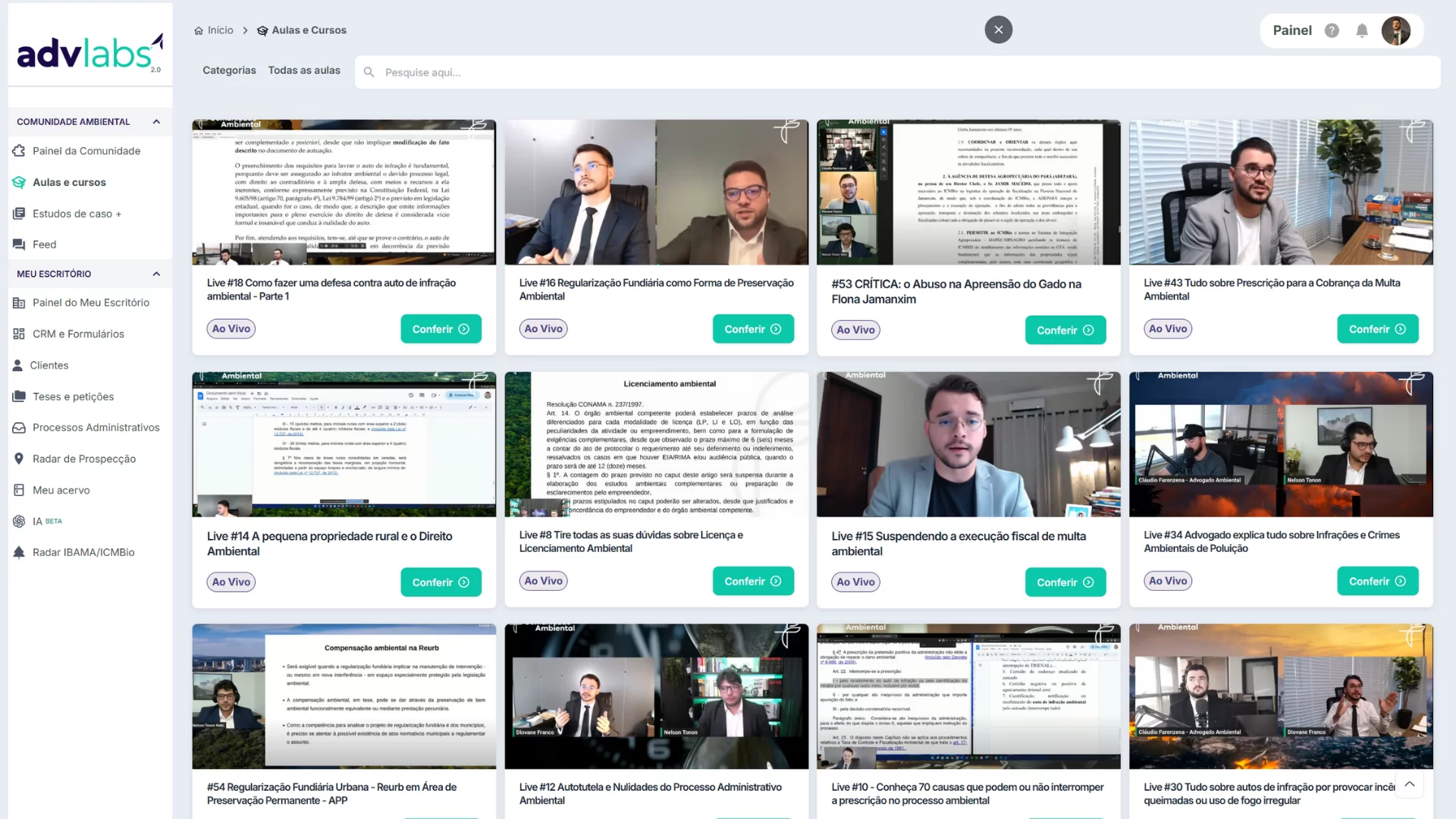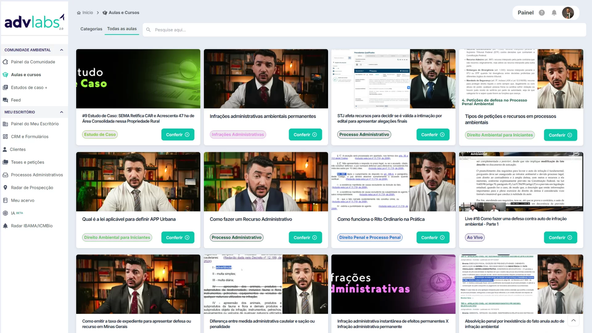 - Na aba Categorias, cada card representa um tema (ex.: Direito Ambiental para Iniciantes, Crimes Ambientais, Processo Administrativo, Estudo de Caso, Ao Vivo).