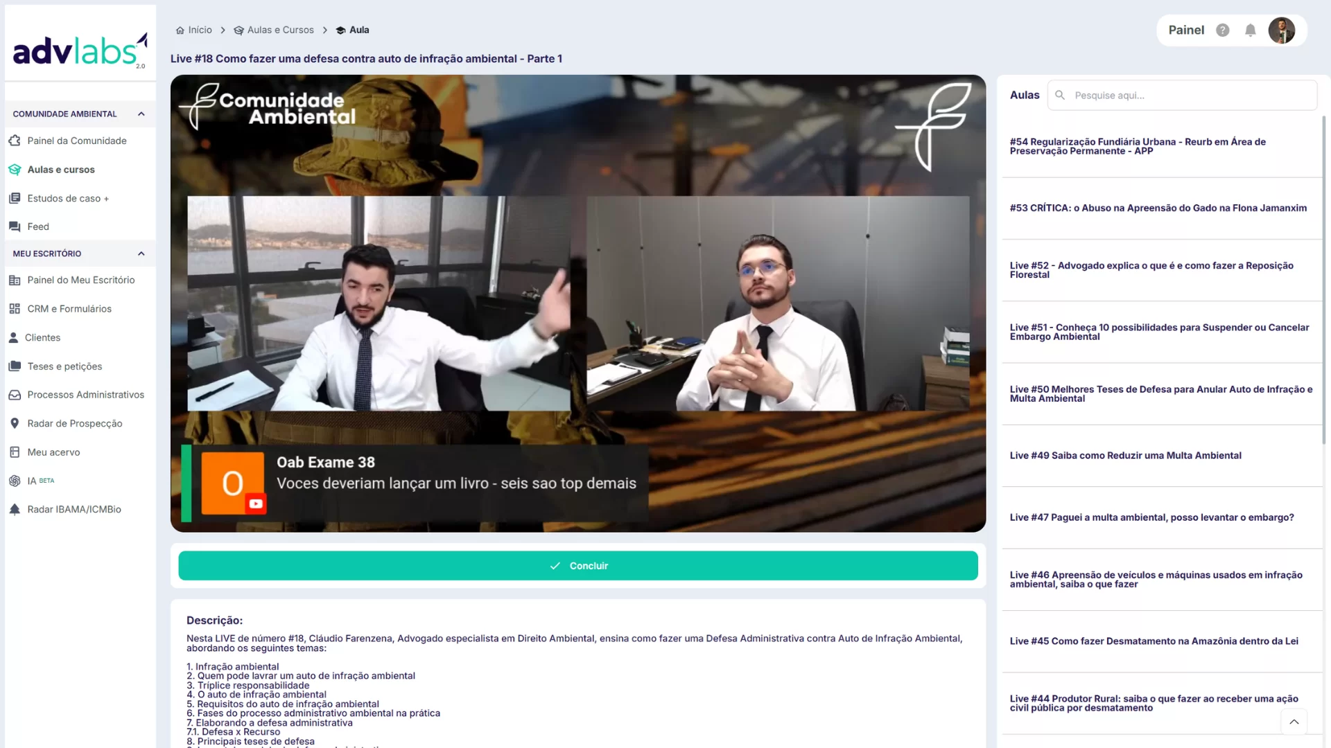 A ferramenta Aulas e Cursos reúne todo o conteúdo formativo do AdvLabs (gravado e ao vivo) organizado por categorias e palavra-chave. Nessa área você pode buscar temas específicos, assistir às aulas, marcar como concluídas e, quando disponível, acessar materiais relacionados ao tema para aprofundar o estudo.