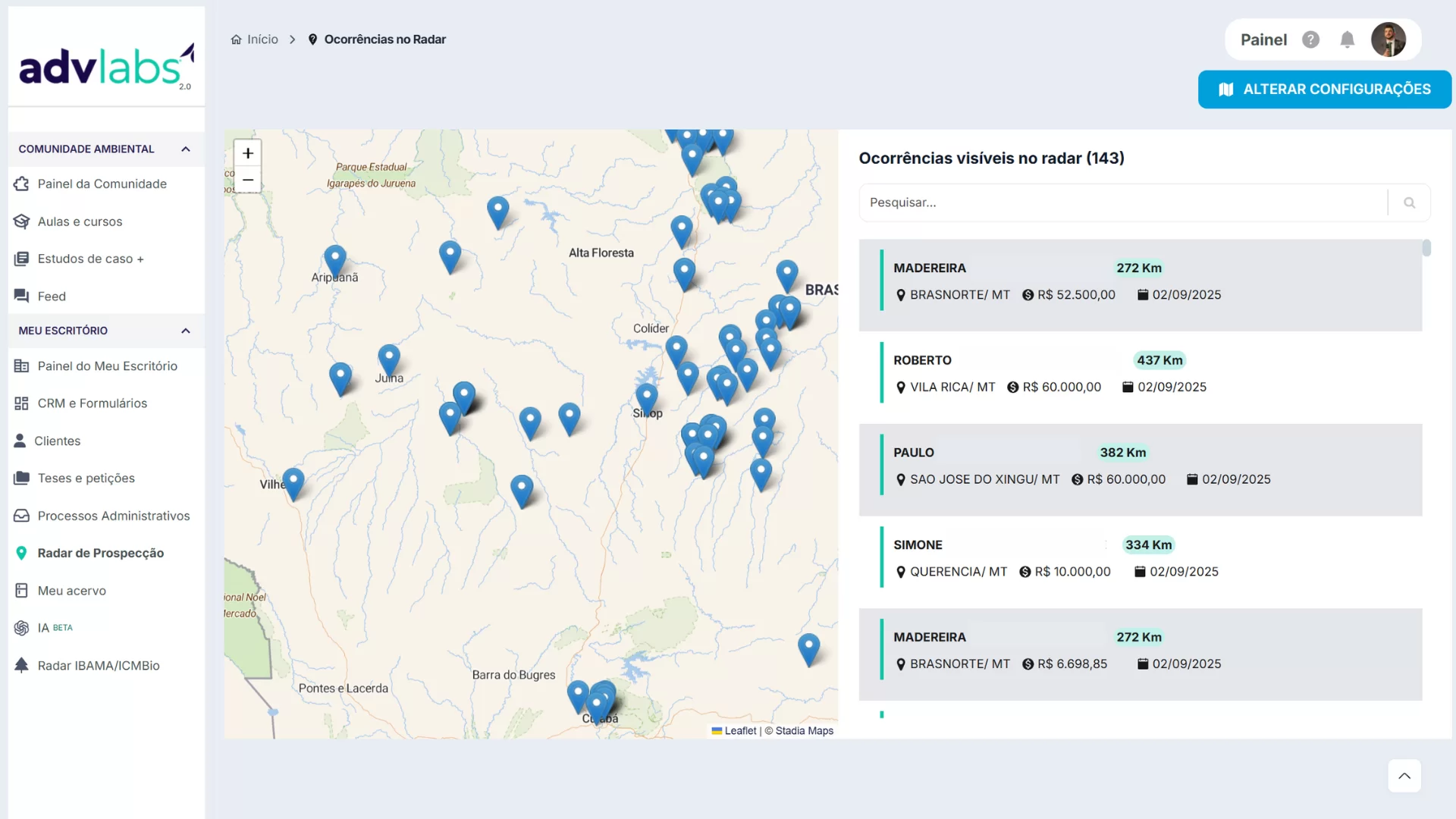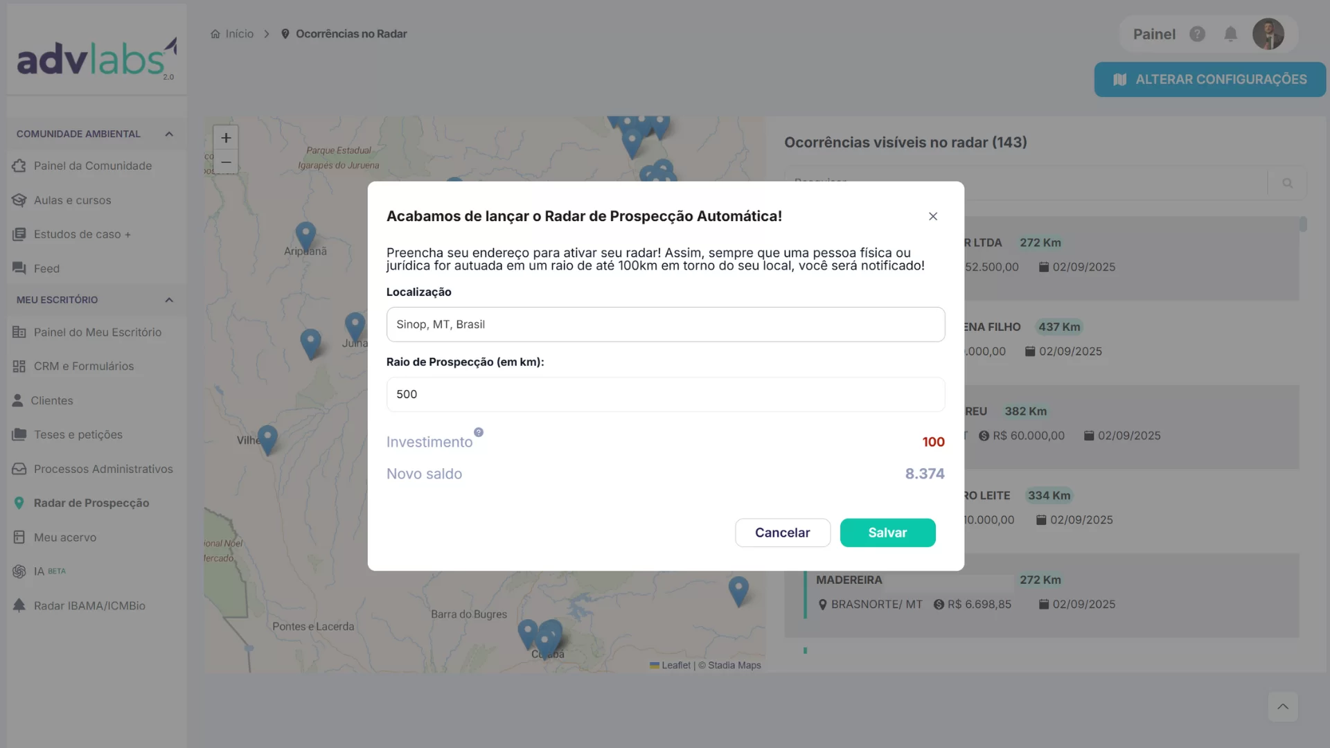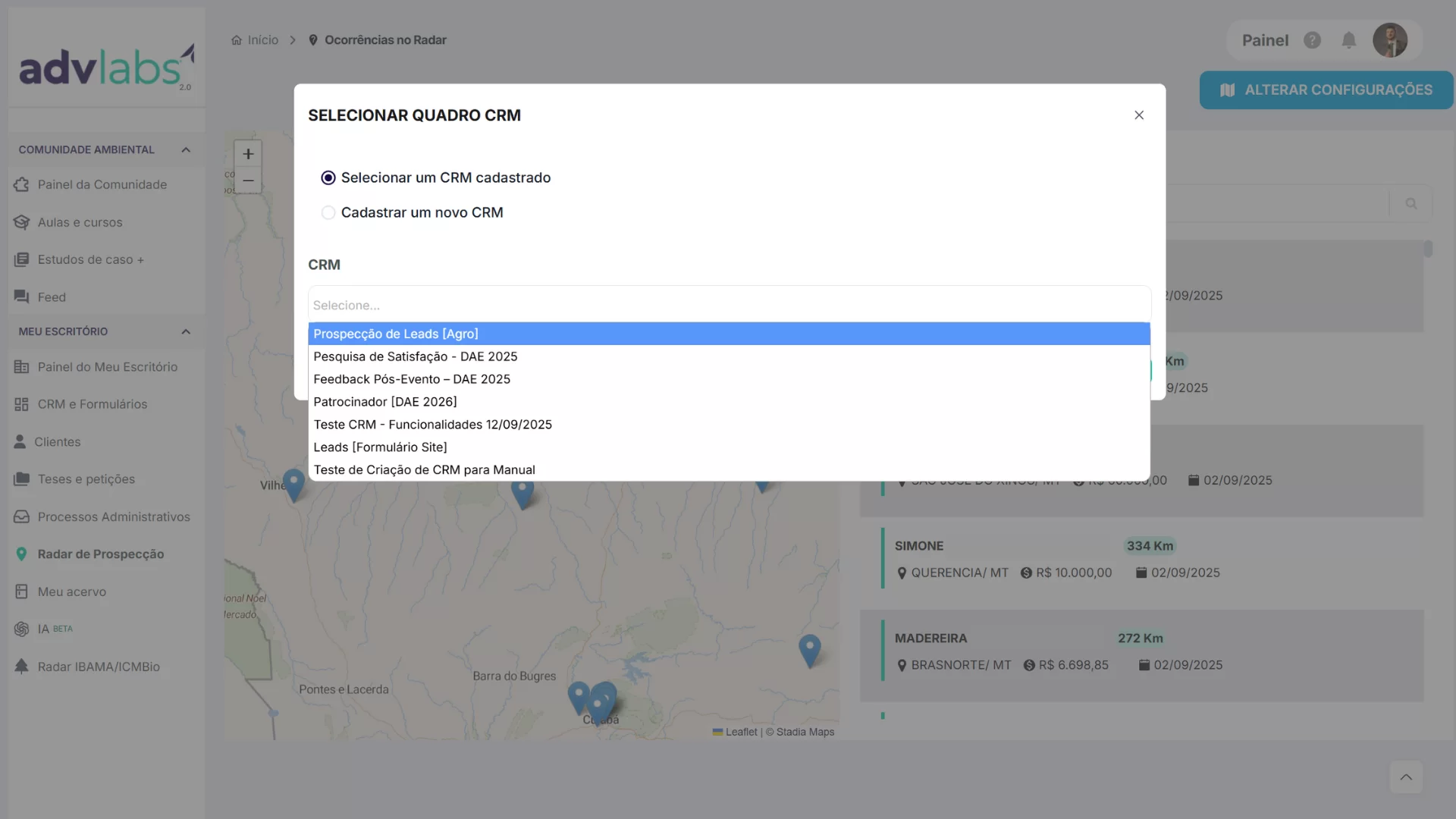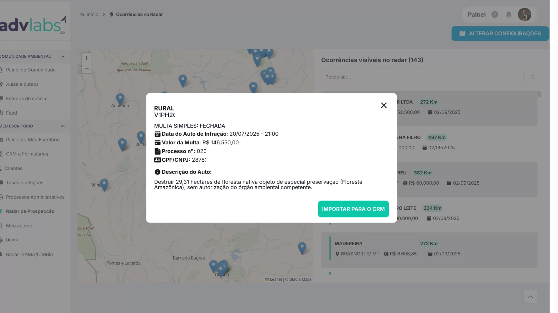 O Radar de Prospecção exibe no mapa e em lista autos de infração recentes (IBAMA/ICMBio) por região. Você define o raio/local, pesquisa ocorrências e importa qualquer autuado como card em um CRM — ferramenta focada em geração ativa de leads.