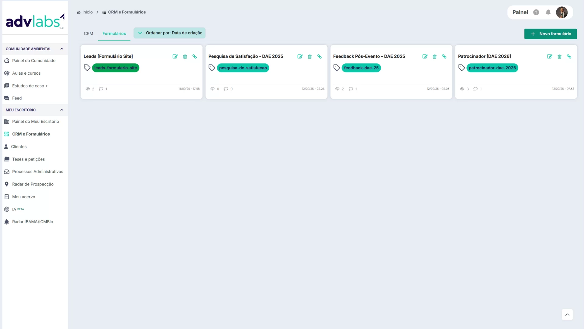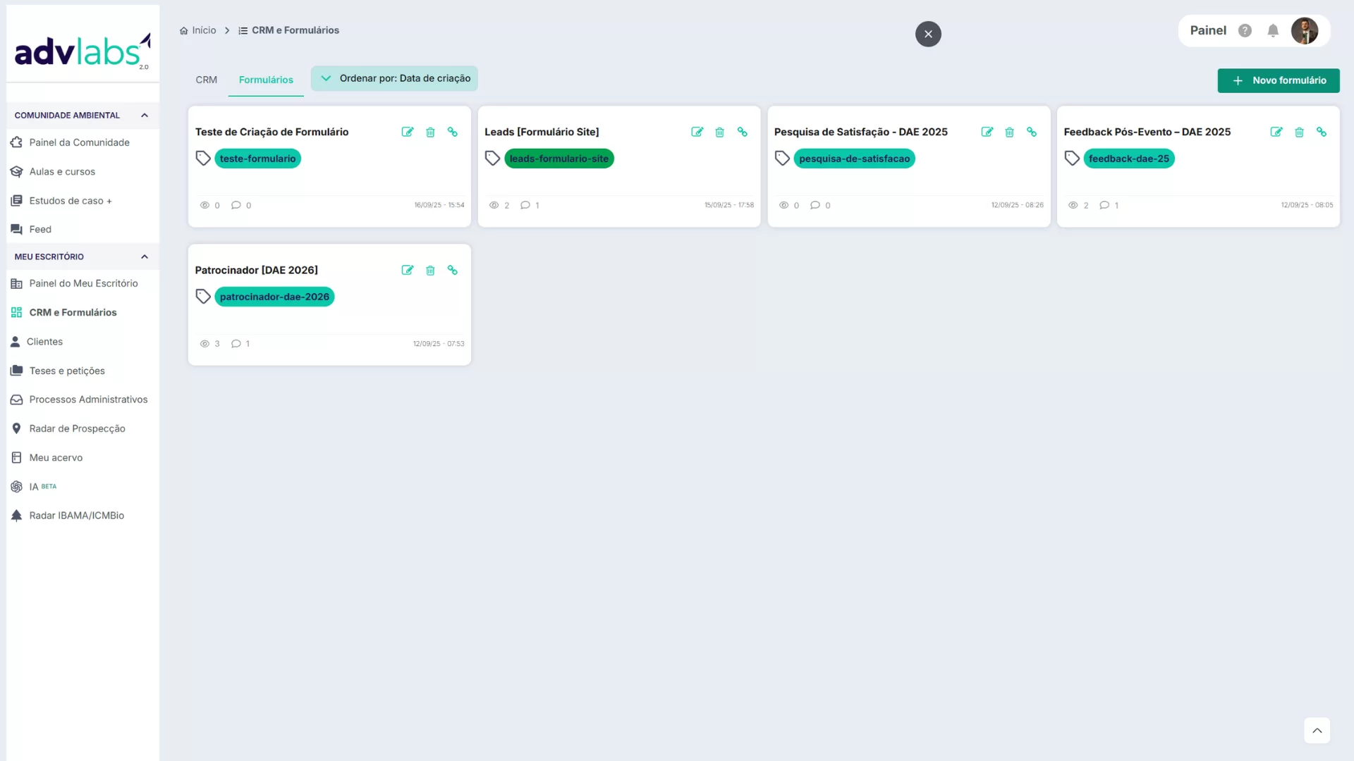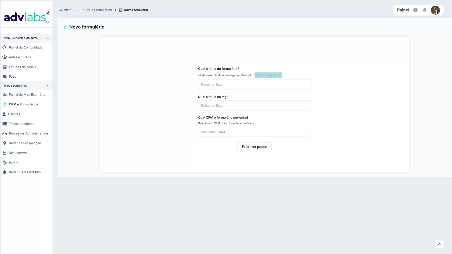 1. Menu lateral → Meu Escritório > CRM e Formulários.