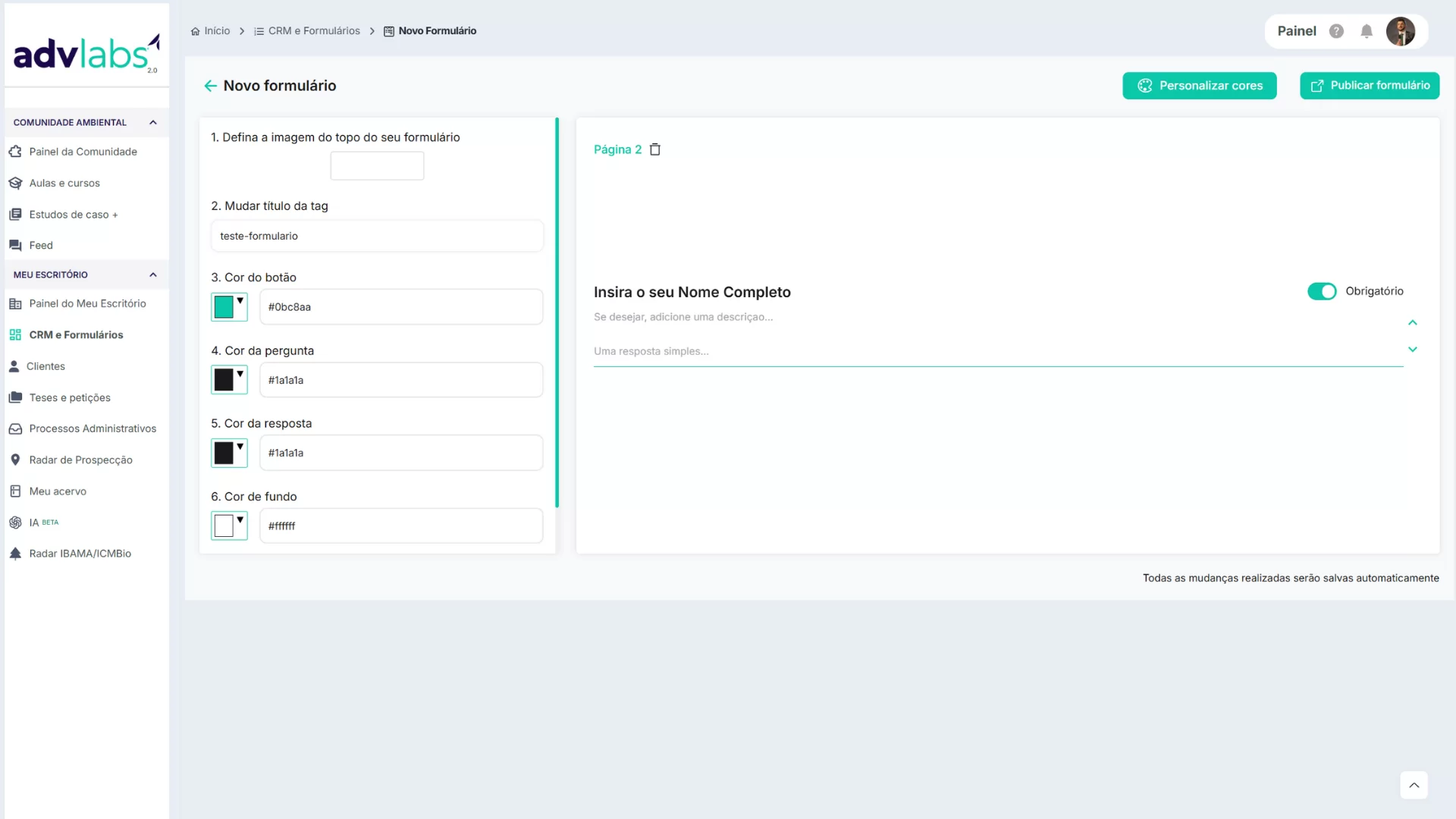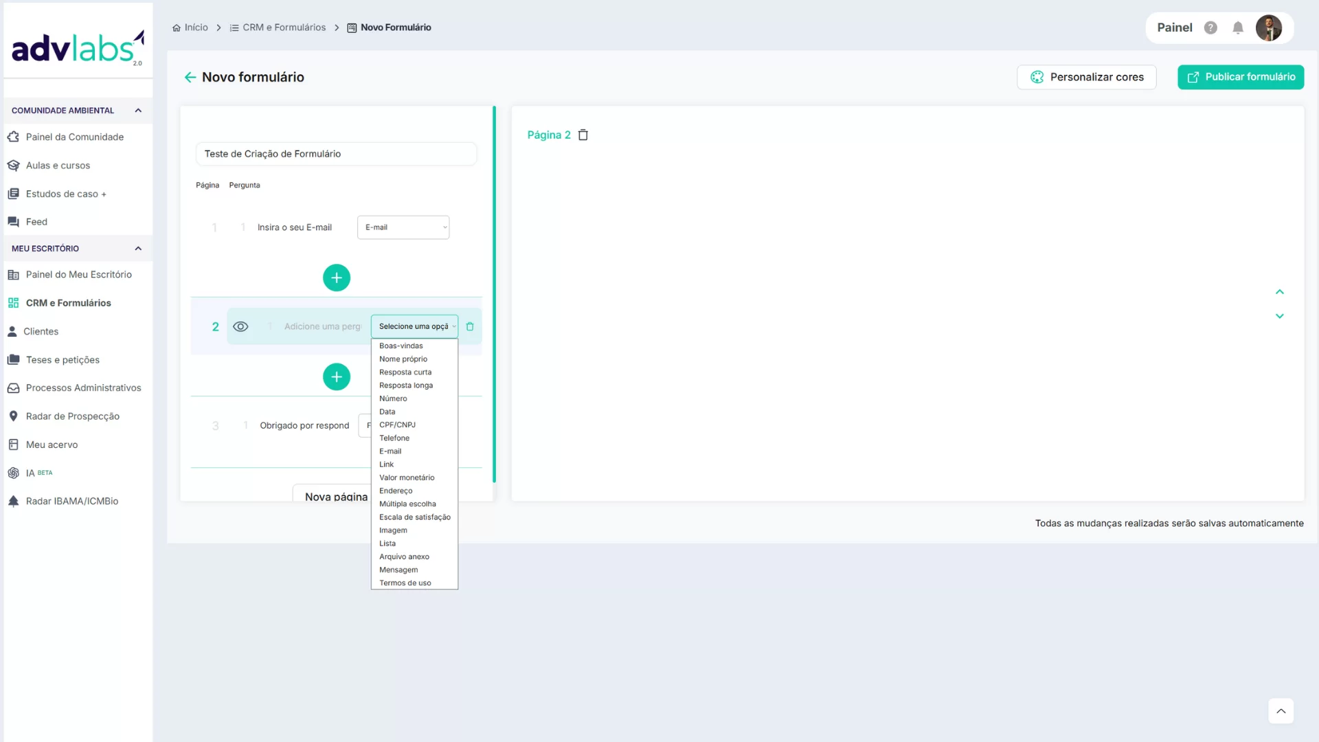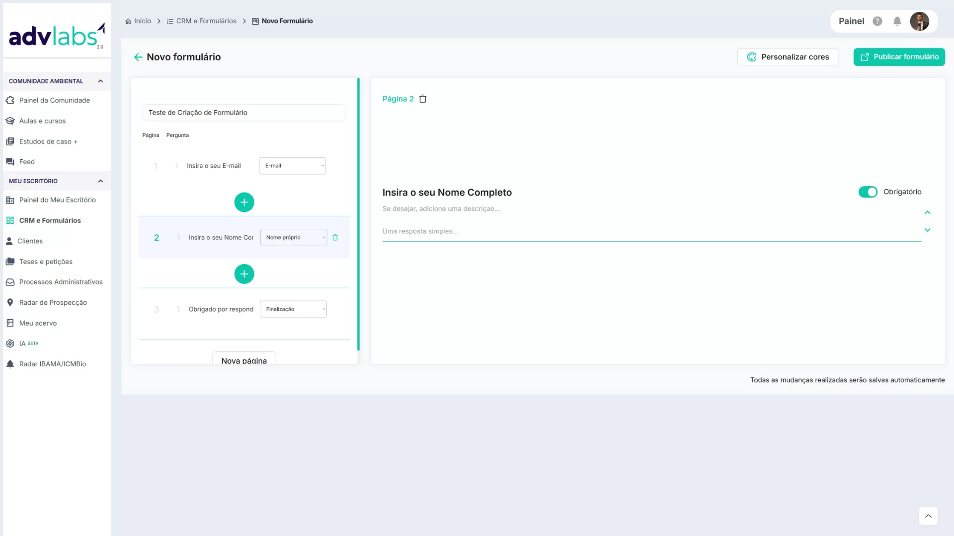 1. Menu lateral → Meu Escritório > CRM e Formulários.