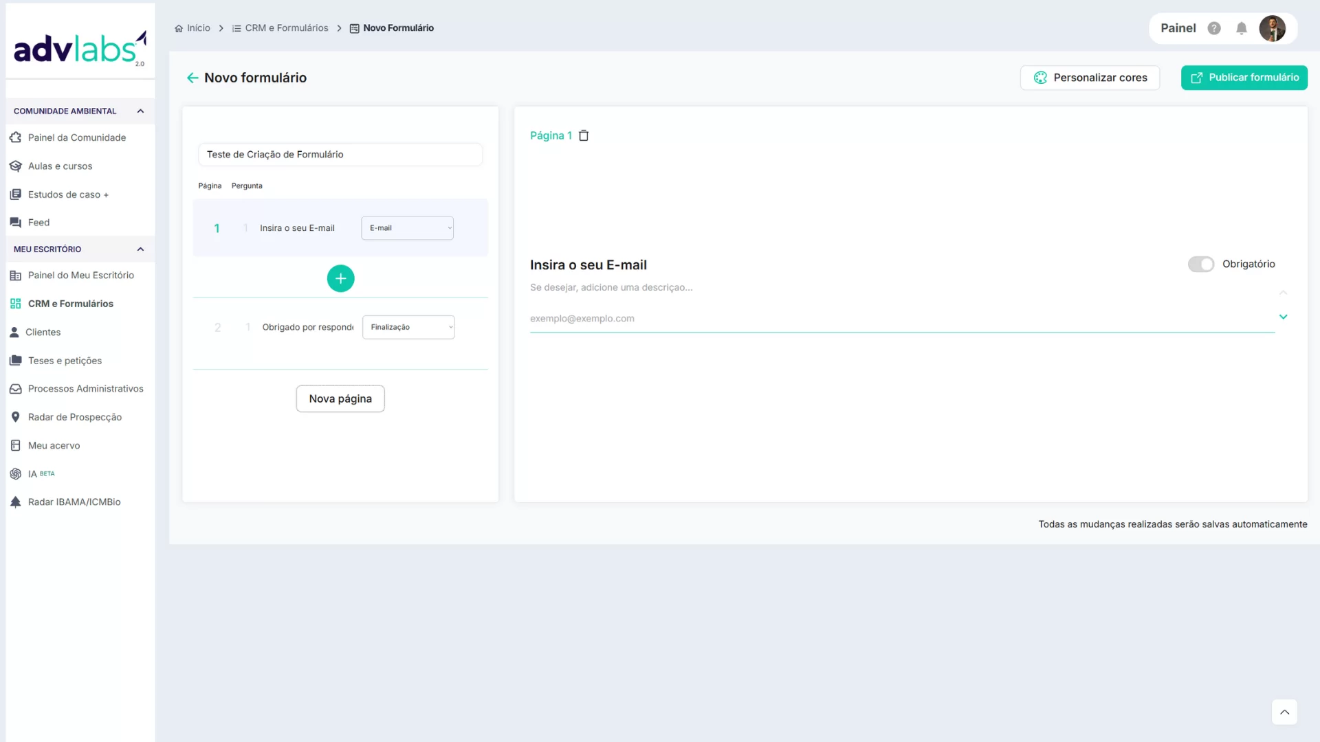 Importante: o E-mail é sempre obrigatório. Todo lead no AdvLabs é vinculado ao e-mail.
