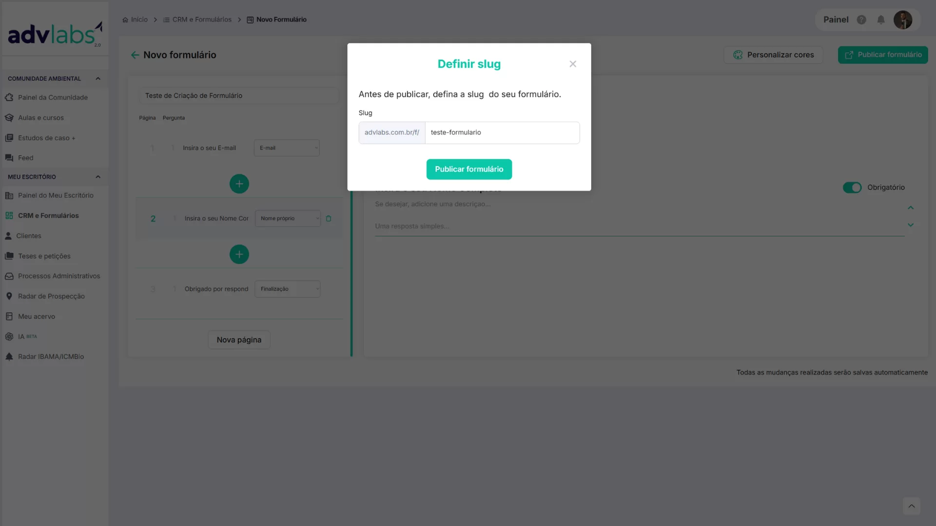 2. Defina a slug (ex.: advlabs.com.br/f/nomedoseuform).