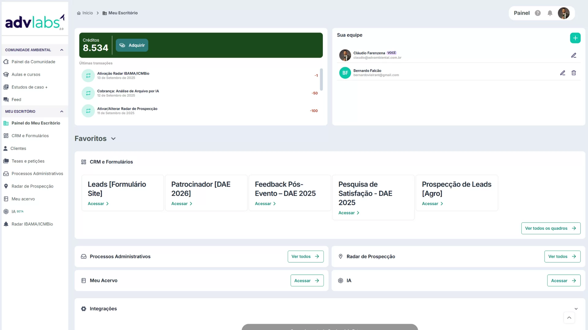 O Painel do Meu Escritório é a sua central de trabalho. Mostra saldo de créditos e últimas transações, sua equipe (com atalhos para convidar, editar ou remover membros) e os principais favoritos/integrações, servindo como ponto de partida rápido para tudo que você faz no AdvLabs.